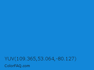 YUV 109.365,53.064,-80.127 Color is a normal blue color and the nearest color is Rich Electric Blue #0892d0. Hex code #1287d9 and RGB value is rgb(18,135,217). In RGB color space, this color is composed of 7% red, 53% green, 85% blue, In CMYK color space, this color is composed of 92% cyan, 38% magenta, 0% yellow , 15% black , In HSL color space, this color has a hue angle of 205° , 85% saturation and 46% lightness.