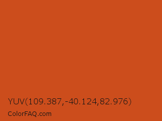 YUV 109.387,-40.124,82.976 Color is a normal orange color and the nearest color is Orange Roughy #c45719. Hex code #cc4d1c and RGB value is rgb(204,77,28). In RGB color space, this color is composed of 80% red, 30% green, 11% blue, In CMYK color space, this color is composed of 0% cyan, 62% magenta, 86% yellow , 20% black , In HSL color space, this color has a hue angle of 17° , 76% saturation and 45% lightness.