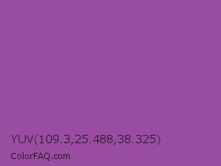 YUV 109.3,25.488,38.325 Color is a normal magenta color and the nearest color is Purpureus #9a4eae. Hex code #994da1 and RGB value is rgb(153,77,161). In RGB color space, this color is composed of 60% red, 30% green, 63% blue, In CMYK color space, this color is composed of 5% cyan, 52% magenta, 0% yellow , 37% black , In HSL color space, this color has a hue angle of 294° , 35% saturation and 47% lightness.