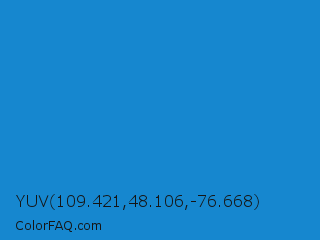 YUV 109.421,48.106,-76.668 Color is a normal blue color and the nearest color is Cyan Cornflower Blue #188bc2. Hex code #1687cf and RGB value is rgb(22,135,207). In RGB color space, this color is composed of 9% red, 53% green, 81% blue, In CMYK color space, this color is composed of 89% cyan, 35% magenta, 0% yellow , 19% black , In HSL color space, this color has a hue angle of 203° , 81% saturation and 45% lightness.