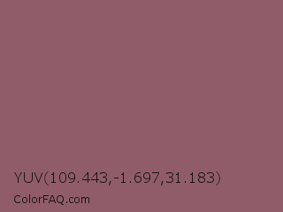 YUV 109.443,-1.697,31.183 Color is a normal rose color and the nearest color is Mauve Taupe #915f6d. Hex code #915c6a and RGB value is rgb(145,92,106). In RGB color space, this color is composed of 57% red, 36% green, 42% blue, In CMYK color space, this color is composed of 0% cyan, 37% magenta, 27% yellow , 43% black , In HSL color space, this color has a hue angle of 344° , 22% saturation and 46% lightness.