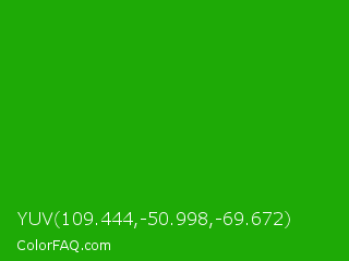 YUV 109.444,-50.998,-69.672 Color is a normal green color and the nearest color is Slimy Green #299617. Hex code #1eaa06 and RGB value is rgb(30,170,6). In RGB color space, this color is composed of 12% red, 67% green, 2% blue, In CMYK color space, this color is composed of 82% cyan, 0% magenta, 96% yellow , 33% black , In HSL color space, this color has a hue angle of 111° , 93% saturation and 35% lightness.