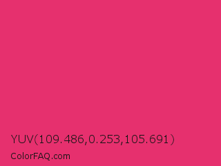 YUV 109.486,0.253,105.691 Color is a normal rose color and the nearest color is Razzmatazz #e3256b. Hex code #e6306e and RGB value is rgb(230,48,110). In RGB color space, this color is composed of 90% red, 19% green, 43% blue, In CMYK color space, this color is composed of 0% cyan, 79% magenta, 52% yellow , 10% black , In HSL color space, this color has a hue angle of 340° , 78% saturation and 55% lightness.
