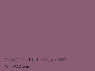 YUV 109.49,3.702,25.88 Color is a normal rose color and the nearest color is Mauve Taupe #915f6d. Hex code #8b5d75 and RGB value is rgb(139,93,117). In RGB color space, this color is composed of 55% red, 36% green, 46% blue, In CMYK color space, this color is composed of 0% cyan, 33% magenta, 16% yellow , 45% black , In HSL color space, this color has a hue angle of 329° , 20% saturation and 45% lightness.