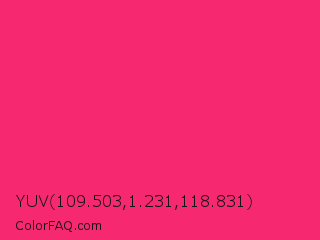 YUV 109.503,1.231,118.831 Color is a normal rose color and the nearest color is Razzmatazz #e3256b. Hex code #f52870 and RGB value is rgb(245,40,112). In RGB color space, this color is composed of 96% red, 16% green, 44% blue, In CMYK color space, this color is composed of 0% cyan, 84% magenta, 54% yellow , 4% black , In HSL color space, this color has a hue angle of 339° , 91% saturation and 56% lightness.