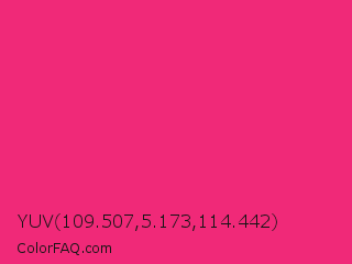 YUV 109.507,5.173,114.442 Color is a normal rose color and the nearest color is Razzmatazz #e3256b. Hex code #f02978 and RGB value is rgb(240,41,120). In RGB color space, this color is composed of 94% red, 16% green, 47% blue, In CMYK color space, this color is composed of 0% cyan, 83% magenta, 50% yellow , 6% black , In HSL color space, this color has a hue angle of 336° , 87% saturation and 55% lightness.