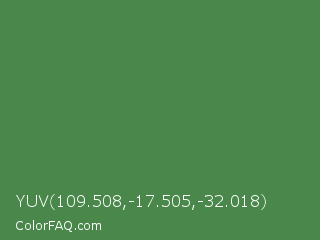 YUV 109.508,-17.505,-32.018 Color is a normal green color and the nearest color is Hippie Green #53824b. Hex code #49874a and RGB value is rgb(73,135,74). In RGB color space, this color is composed of 29% red, 53% green, 29% blue, In CMYK color space, this color is composed of 46% cyan, 0% magenta, 45% yellow , 47% black , In HSL color space, this color has a hue angle of 121° , 30% saturation and 41% lightness.