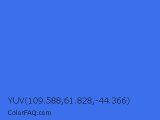 YUV 109.588,61.828,-44.366 Color is a normal blue color and the nearest color is Royal Blue #4169e1. Hex code #3b6feb and RGB value is rgb(59,111,235). In RGB color space, this color is composed of 23% red, 44% green, 92% blue, In CMYK color space, this color is composed of 75% cyan, 53% magenta, 0% yellow , 8% black , In HSL color space, this color has a hue angle of 222° , 81% saturation and 58% lightness.