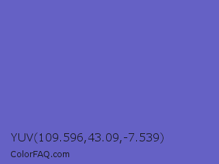 YUV 109.596,43.09,-7.539 Color is a normal indigo color and the nearest color is Slate Blue #6a5acd. Hex code #6561c5 and RGB value is rgb(101,97,197). In RGB color space, this color is composed of 40% red, 38% green, 77% blue, In CMYK color space, this color is composed of 49% cyan, 51% magenta, 0% yellow , 23% black , In HSL color space, this color has a hue angle of 242° , 46% saturation and 58% lightness.