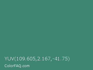 YUV 109.605,2.167,-41.75 Color is a normal cyan color and the nearest color is Viridian #40826d. Hex code #3e8572 and RGB value is rgb(62,133,114). In RGB color space, this color is composed of 24% red, 52% green, 45% blue, In CMYK color space, this color is composed of 53% cyan, 0% magenta, 14% yellow , 48% black , In HSL color space, this color has a hue angle of 164° , 36% saturation and 38% lightness.
