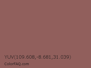 YUV 109.608,-8.681,31.039 Color is a normal red color and the nearest color is Rose Taupe #905d5d. Hex code #915f5c and RGB value is rgb(145,95,92). In RGB color space, this color is composed of 57% red, 37% green, 36% blue, In CMYK color space, this color is composed of 0% cyan, 34% magenta, 37% yellow , 43% black , In HSL color space, this color has a hue angle of 3° , 22% saturation and 46% lightness.