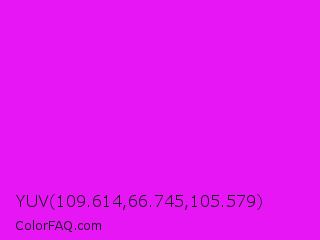YUV 109.614,66.745,105.579 Color is a normal magenta color and the nearest color is Phlox #df00ff. Hex code #e616f5 and RGB value is rgb(230,22,245). In RGB color space, this color is composed of 90% red, 9% green, 96% blue, In CMYK color space, this color is composed of 6% cyan, 91% magenta, 0% yellow , 4% black , In HSL color space, this color has a hue angle of 296° , 92% saturation and 52% lightness.