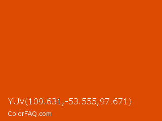 YUV 109.631,-53.555,97.671 Color is a normal orange color and the nearest color is Grenadier #d54600. Hex code #dd4a01 and RGB value is rgb(221,74,1). In RGB color space, this color is composed of 87% red, 29% green, 0% blue, In CMYK color space, this color is composed of 0% cyan, 67% magenta, 100% yellow , 13% black , In HSL color space, this color has a hue angle of 20° , 99% saturation and 44% lightness.