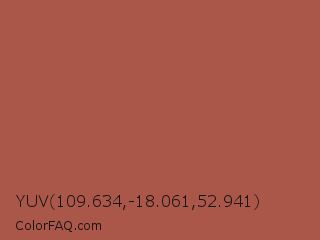 YUV 109.634,-18.061,52.941 Color is a normal red color and the nearest color is Redwood #a45a52. Hex code #aa5649 and RGB value is rgb(170,86,73). In RGB color space, this color is composed of 67% red, 34% green, 29% blue, In CMYK color space, this color is composed of 0% cyan, 49% magenta, 57% yellow , 33% black , In HSL color space, this color has a hue angle of 8° , 40% saturation and 48% lightness.