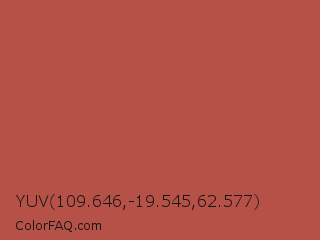 YUV 109.646,-19.545,62.577 Color is a normal red color and the nearest color is Deep Chestnut #b94e48. Hex code #b55146 and RGB value is rgb(181,81,70). In RGB color space, this color is composed of 71% red, 32% green, 27% blue, In CMYK color space, this color is composed of 0% cyan, 55% magenta, 61% yellow , 29% black , In HSL color space, this color has a hue angle of 6° , 44% saturation and 49% lightness.