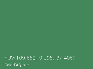 YUV 109.652,-9.195,-37.406 Color is a normal green color and the nearest color is Middle Green #4d8c57. Hex code #43875b and RGB value is rgb(67,135,91). In RGB color space, this color is composed of 26% red, 53% green, 36% blue, In CMYK color space, this color is composed of 50% cyan, 0% magenta, 33% yellow , 47% black , In HSL color space, this color has a hue angle of 141° , 34% saturation and 40% lightness.