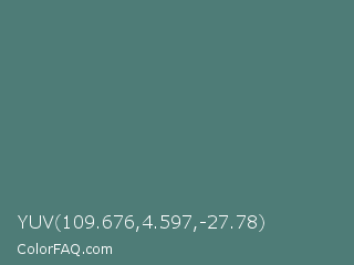 YUV 109.676,4.597,-27.78 Color is a normal cyan color and the nearest color is Cutty Sark #507672. Hex code #4e7c77 and RGB value is rgb(78,124,119). In RGB color space, this color is composed of 31% red, 49% green, 47% blue, In CMYK color space, this color is composed of 37% cyan, 0% magenta, 4% yellow , 51% black , In HSL color space, this color has a hue angle of 173° , 23% saturation and 40% lightness.