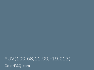 YUV 109.68,11.99,-19.013 Color is a normal blue color and the nearest color is Bismark #497183. Hex code #587486 and RGB value is rgb(88,116,134). In RGB color space, this color is composed of 35% red, 45% green, 53% blue, In CMYK color space, this color is composed of 34% cyan, 13% magenta, 0% yellow , 47% black , In HSL color space, this color has a hue angle of 203° , 21% saturation and 44% lightness.