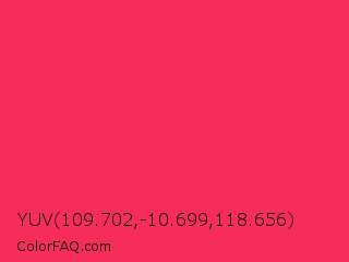 YUV 109.702,-10.699,118.656 Color is a normal red color and the nearest color is Radical Red #ff355e. Hex code #f52d58 and RGB value is rgb(245,45,88). In RGB color space, this color is composed of 96% red, 18% green, 35% blue, In CMYK color space, this color is composed of 0% cyan, 82% magenta, 64% yellow , 4% black , In HSL color space, this color has a hue angle of 347° , 91% saturation and 57% lightness.