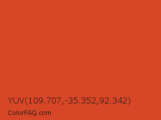 YUV 109.707,-35.352,92.342 Color is a normal red color and the nearest color is Punch #dc4333. Hex code #d74626 and RGB value is rgb(215,70,38). In RGB color space, this color is composed of 84% red, 27% green, 15% blue, In CMYK color space, this color is composed of 0% cyan, 67% magenta, 82% yellow , 16% black , In HSL color space, this color has a hue angle of 11° , 70% saturation and 50% lightness.
