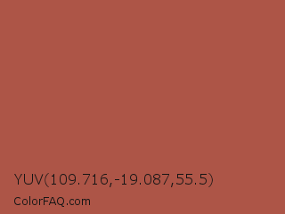 YUV 109.716,-19.087,55.5 Color is a normal red color and the nearest color is Apple Blossom #af4d43. Hex code #ad5547 and RGB value is rgb(173,85,71). In RGB color space, this color is composed of 68% red, 33% green, 28% blue, In CMYK color space, this color is composed of 0% cyan, 51% magenta, 59% yellow , 32% black , In HSL color space, this color has a hue angle of 8° , 42% saturation and 48% lightness.