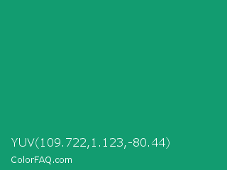 YUV 109.722,1.123,-80.44 Color is a normal green color and the nearest color is Green NCS #009f6b. Hex code #129c70 and RGB value is rgb(18,156,112). In RGB color space, this color is composed of 7% red, 61% green, 44% blue, In CMYK color space, this color is composed of 88% cyan, 0% magenta, 28% yellow , 39% black , In HSL color space, this color has a hue angle of 161° , 79% saturation and 34% lightness.