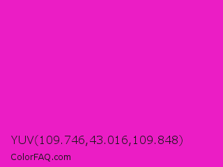 YUV 109.746,43.016,109.848 Color is a normal magenta color and the nearest color is Hot Magenta #ff1dce. Hex code #eb1dc5 and RGB value is rgb(235,29,197). In RGB color space, this color is composed of 92% red, 11% green, 77% blue, In CMYK color space, this color is composed of 0% cyan, 88% magenta, 16% yellow , 8% black , In HSL color space, this color has a hue angle of 311° , 84% saturation and 52% lightness.
