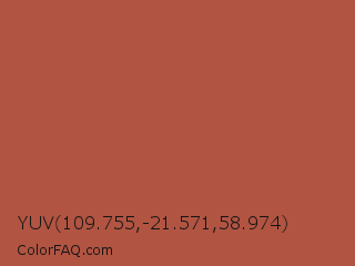 YUV 109.755,-21.571,58.974 Color is a normal red color and the nearest color is Brown Rust #af593e. Hex code #b15442 and RGB value is rgb(177,84,66). In RGB color space, this color is composed of 69% red, 33% green, 26% blue, In CMYK color space, this color is composed of 0% cyan, 53% magenta, 63% yellow , 31% black , In HSL color space, this color has a hue angle of 10° , 46% saturation and 48% lightness.