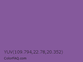 YUV 109.794,22.78,20.352 Color is a normal purple color and the nearest color is Trendy Pink #8c6495. Hex code #85599c and RGB value is rgb(133,89,156). In RGB color space, this color is composed of 52% red, 35% green, 61% blue, In CMYK color space, this color is composed of 15% cyan, 43% magenta, 0% yellow , 39% black , In HSL color space, this color has a hue angle of 279° , 27% saturation and 48% lightness.