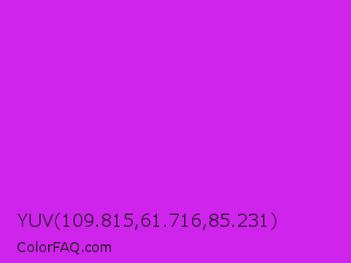 YUV 109.815,61.716,85.231 Color is a normal magenta color and the nearest color is Vivid Mulberry #b80ce3. Hex code #cf24eb and RGB value is rgb(207,36,235). In RGB color space, this color is composed of 81% red, 14% green, 92% blue, In CMYK color space, this color is composed of 12% cyan, 85% magenta, 0% yellow , 8% black , In HSL color space, this color has a hue angle of 292° , 83% saturation and 53% lightness.