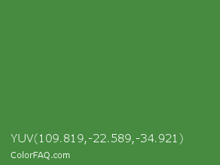 YUV 109.819,-22.589,-34.921 Color is a normal green color and the nearest color is May Green #4c9141. Hex code #468b40 and RGB value is rgb(70,139,64). In RGB color space, this color is composed of 27% red, 55% green, 25% blue, In CMYK color space, this color is composed of 50% cyan, 0% magenta, 54% yellow , 45% black , In HSL color space, this color has a hue angle of 115° , 37% saturation and 40% lightness.