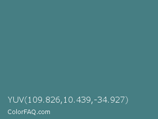 YUV 109.826,10.439,-34.927 Color is a normal cyan color and the nearest color is Bismark #497183. Hex code #467e83 and RGB value is rgb(70,126,131). In RGB color space, this color is composed of 27% red, 49% green, 51% blue, In CMYK color space, this color is composed of 47% cyan, 4% magenta, 0% yellow , 49% black , In HSL color space, this color has a hue angle of 185° , 30% saturation and 39% lightness.
