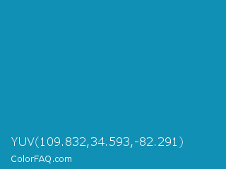 YUV 109.832,34.593,-82.291 Color is a normal cyan color and the nearest color is Blue Green #0d98ba. Hex code #1090b4 and RGB value is rgb(16,144,180). In RGB color space, this color is composed of 6% red, 56% green, 71% blue, In CMYK color space, this color is composed of 91% cyan, 20% magenta, 0% yellow , 29% black , In HSL color space, this color has a hue angle of 193° , 84% saturation and 38% lightness.