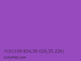 YUV 109.834,39.029,35.226 Color is a normal purple color and the nearest color is Deep Lilac #9955bb. Hex code #964abd and RGB value is rgb(150,74,189). In RGB color space, this color is composed of 59% red, 29% green, 74% blue, In CMYK color space, this color is composed of 21% cyan, 61% magenta, 0% yellow , 26% black , In HSL color space, this color has a hue angle of 280° , 47% saturation and 52% lightness.