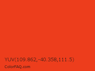 YUV 109.862,-40.358,111.5 Color is a normal red color and the nearest color is Pomegranate #f34723. Hex code #ed3d1c and RGB value is rgb(237,61,28). In RGB color space, this color is composed of 93% red, 24% green, 11% blue, In CMYK color space, this color is composed of 0% cyan, 74% magenta, 88% yellow , 7% black , In HSL color space, this color has a hue angle of 9° , 85% saturation and 52% lightness.
