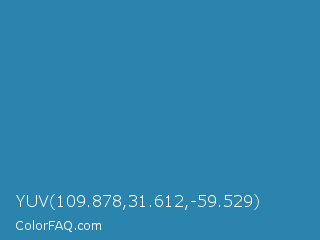 YUV 109.878,31.612,-59.529 Color is a normal blue color and the nearest color is Astral #327da0. Hex code #2a84ae and RGB value is rgb(42,132,174). In RGB color space, this color is composed of 16% red, 52% green, 68% blue, In CMYK color space, this color is composed of 76% cyan, 24% magenta, 0% yellow , 32% black , In HSL color space, this color has a hue angle of 199° , 61% saturation and 42% lightness.