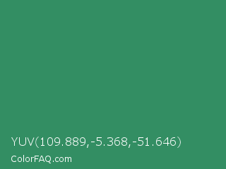 YUV 109.889,-5.368,-51.646 Color is a normal green color and the nearest color is Sea Green #2e8b57. Hex code #338e63 and RGB value is rgb(51,142,99). In RGB color space, this color is composed of 20% red, 56% green, 39% blue, In CMYK color space, this color is composed of 64% cyan, 0% magenta, 30% yellow , 44% black , In HSL color space, this color has a hue angle of 152° , 47% saturation and 38% lightness.