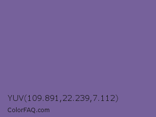 YUV 109.891,22.239,7.112 Color is a normal violet color and the nearest color is Kimberly #736c9f. Hex code #76619b and RGB value is rgb(118,97,155). In RGB color space, this color is composed of 46% red, 38% green, 61% blue, In CMYK color space, this color is composed of 24% cyan, 37% magenta, 0% yellow , 39% black , In HSL color space, this color has a hue angle of 262° , 23% saturation and 49% lightness.