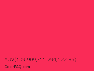 YUV 109.909,-11.294,122.86 Color is a normal red color and the nearest color is Awesome #ff2052. Hex code #fa2b57 and RGB value is rgb(250,43,87). In RGB color space, this color is composed of 98% red, 17% green, 34% blue, In CMYK color space, this color is composed of 0% cyan, 83% magenta, 65% yellow , 2% black , In HSL color space, this color has a hue angle of 347° , 95% saturation and 57% lightness.