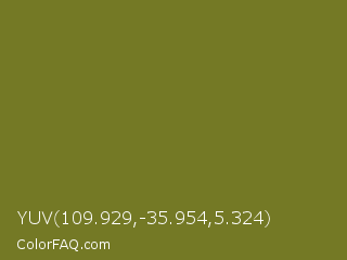 YUV 109.929,-35.954,5.324 Color is a normal yellow color and the nearest color is Crete #737829. Hex code #747925 and RGB value is rgb(116,121,37). In RGB color space, this color is composed of 45% red, 47% green, 15% blue, In CMYK color space, this color is composed of 4% cyan, 0% magenta, 69% yellow , 53% black , In HSL color space, this color has a hue angle of 64° , 53% saturation and 31% lightness.