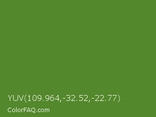 YUV 109.964,-32.52,-22.77 Color is a normal green color and the nearest color is Sap Green #507d2a. Hex code #54882c and RGB value is rgb(84,136,44). In RGB color space, this color is composed of 33% red, 53% green, 17% blue, In CMYK color space, this color is composed of 38% cyan, 0% magenta, 68% yellow , 47% black , In HSL color space, this color has a hue angle of 94° , 51% saturation and 35% lightness.