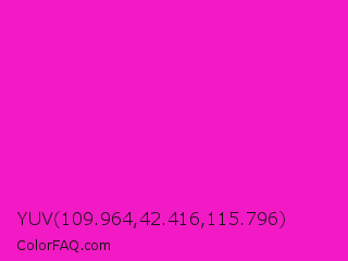 YUV 109.964,42.416,115.796 Color is a normal magenta color and the nearest color is Shocking Pink #fc0fc0. Hex code #f21ac4 and RGB value is rgb(242,26,196). In RGB color space, this color is composed of 95% red, 10% green, 77% blue, In CMYK color space, this color is composed of 0% cyan, 89% magenta, 19% yellow , 5% black , In HSL color space, this color has a hue angle of 313° , 89% saturation and 53% lightness.