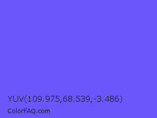 YUV 109.975,68.539,-3.486 Color is a light indigo color and the nearest color is Very Light Blue #6666ff. Hex code #6a55f9 and RGB value is rgb(106,85,249). In RGB color space, this color is composed of 42% red, 33% green, 98% blue, In CMYK color space, this color is composed of 57% cyan, 66% magenta, 0% yellow , 2% black , In HSL color space, this color has a hue angle of 248° , 93% saturation and 65% lightness.