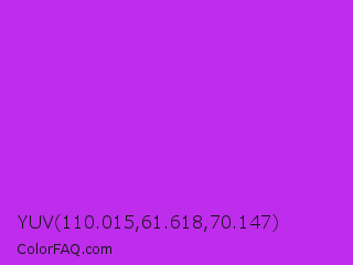 YUV 110.015,61.618,70.147 Color is a normal purple color and the nearest color is Veronica #a020f0. Hex code #be2deb and RGB value is rgb(190,45,235). In RGB color space, this color is composed of 75% red, 18% green, 92% blue, In CMYK color space, this color is composed of 19% cyan, 81% magenta, 0% yellow , 8% black , In HSL color space, this color has a hue angle of 286° , 83% saturation and 55% lightness.