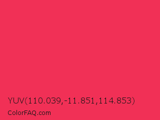 YUV 110.039,-11.851,114.853 Color is a normal red color and the nearest color is Desire #ea3c53. Hex code #f13056 and RGB value is rgb(241,48,86). In RGB color space, this color is composed of 95% red, 19% green, 34% blue, In CMYK color space, this color is composed of 0% cyan, 80% magenta, 64% yellow , 5% black , In HSL color space, this color has a hue angle of 348° , 87% saturation and 57% lightness.