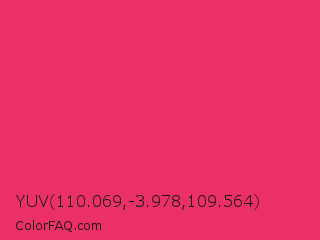 YUV 110.069,-3.978,109.564 Color is a normal rose color and the nearest color is Cerise Red #de3163. Hex code #eb3066 and RGB value is rgb(235,48,102). In RGB color space, this color is composed of 92% red, 19% green, 40% blue, In CMYK color space, this color is composed of 0% cyan, 80% magenta, 57% yellow , 8% black , In HSL color space, this color has a hue angle of 343° , 82% saturation and 55% lightness.