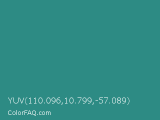 YUV 110.096,10.799,-57.089 Color is a normal cyan color and the nearest color is Lochinvar #2c8c84. Hex code #2d8b84 and RGB value is rgb(45,139,132). In RGB color space, this color is composed of 18% red, 55% green, 52% blue, In CMYK color space, this color is composed of 68% cyan, 0% magenta, 5% yellow , 45% black , In HSL color space, this color has a hue angle of 176° , 51% saturation and 36% lightness.