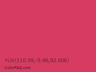 YUV 110.09,-5.96,92.006 Color is a normal red color and the nearest color is Cerise Red #de3163. Hex code #d73b62 and RGB value is rgb(215,59,98). In RGB color space, this color is composed of 84% red, 23% green, 38% blue, In CMYK color space, this color is composed of 0% cyan, 73% magenta, 54% yellow , 16% black , In HSL color space, this color has a hue angle of 345° , 66% saturation and 54% lightness.