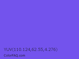 YUV 110.124,62.55,4.276 Color is a light indigo color and the nearest color is Medium Slate Blue #7b68ee. Hex code #7353ed and RGB value is rgb(115,83,237). In RGB color space, this color is composed of 45% red, 33% green, 93% blue, In CMYK color space, this color is composed of 51% cyan, 65% magenta, 0% yellow , 7% black , In HSL color space, this color has a hue angle of 252° , 81% saturation and 63% lightness.