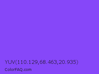 YUV 110.129,68.463,20.935 Color is a light violet color and the nearest color is Navy Purple #9457eb. Hex code #8647f9 and RGB value is rgb(134,71,249). In RGB color space, this color is composed of 53% red, 28% green, 98% blue, In CMYK color space, this color is composed of 46% cyan, 71% magenta, 0% yellow , 2% black , In HSL color space, this color has a hue angle of 261° , 94% saturation and 63% lightness.
